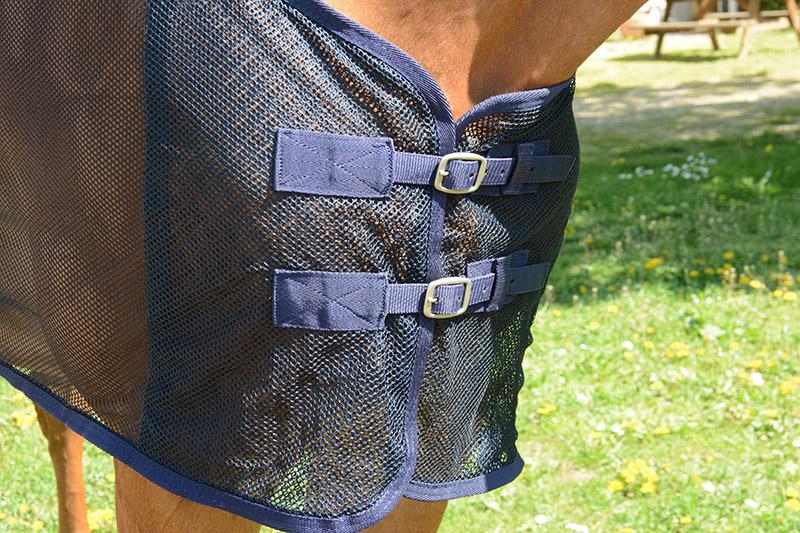Chemise filet nid d'abeille pour protéger le cheval des piqures insectes. Deux sangles ventrales croisées. Courroie de queue.