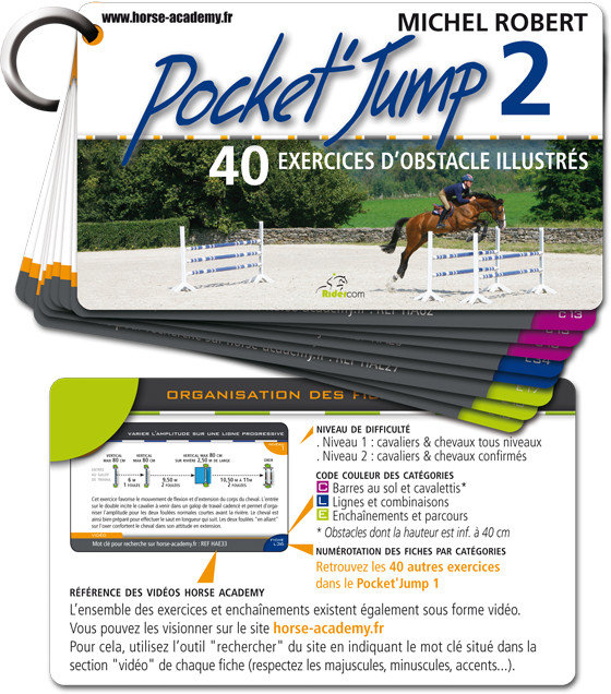 40 NOUVEAUX exercices d'obstacle de Michel Robert. Son mini format (12 cm x 7 cm) vous permet de le glisser dans votre poche pour en disposer sur votre terrain d'entraînement. Ce nouveau Pocket'Jump vient compléter la collection d'exercices Michel Robert. Ces exercices, comme ceux du premier Pocket'Jump, peuvent aussi être consultés en version vidéos sur Horse Academy.