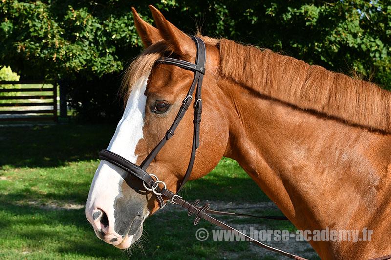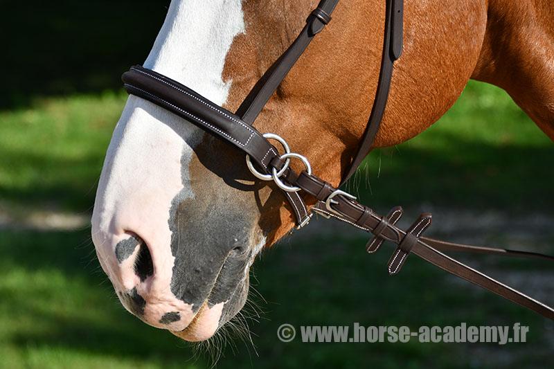 Très beau filet en cuir de buffle tanné végétal. Utilisation sans mors. Les rênes sont fixées sur des montants de sous gorge coulissants et permettant une action sur la nuque et la muserolle du filet.