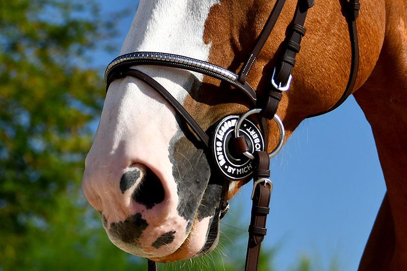 Très beau filet en cuir de buffle tanné végétal, avec muserolle combinée. Frontal et muserolle décorés clencher argenté.