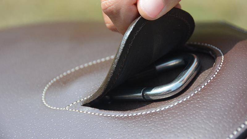 . L’attache de la martingale est équipée d’un cache en cuir pour éviter l’accrochage des fers dans le mousqueton au moment des sauts.