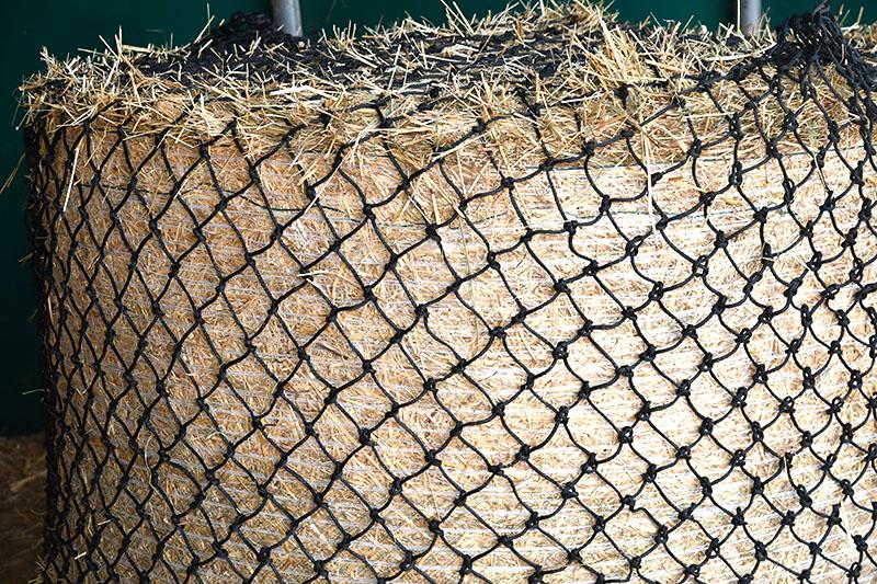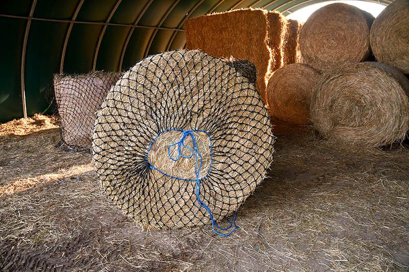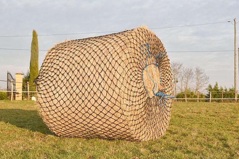 Les filets à foin pour balles rondes doivent être utilisés dans un râtelier à foin afin d’éviter l’accrochage des fers dans les mailles. Ne pas utiliser dans les près abritant des équidés de petites tailles (foals, shetlands..) susceptibles de passer le nez dans les mailles du filet.